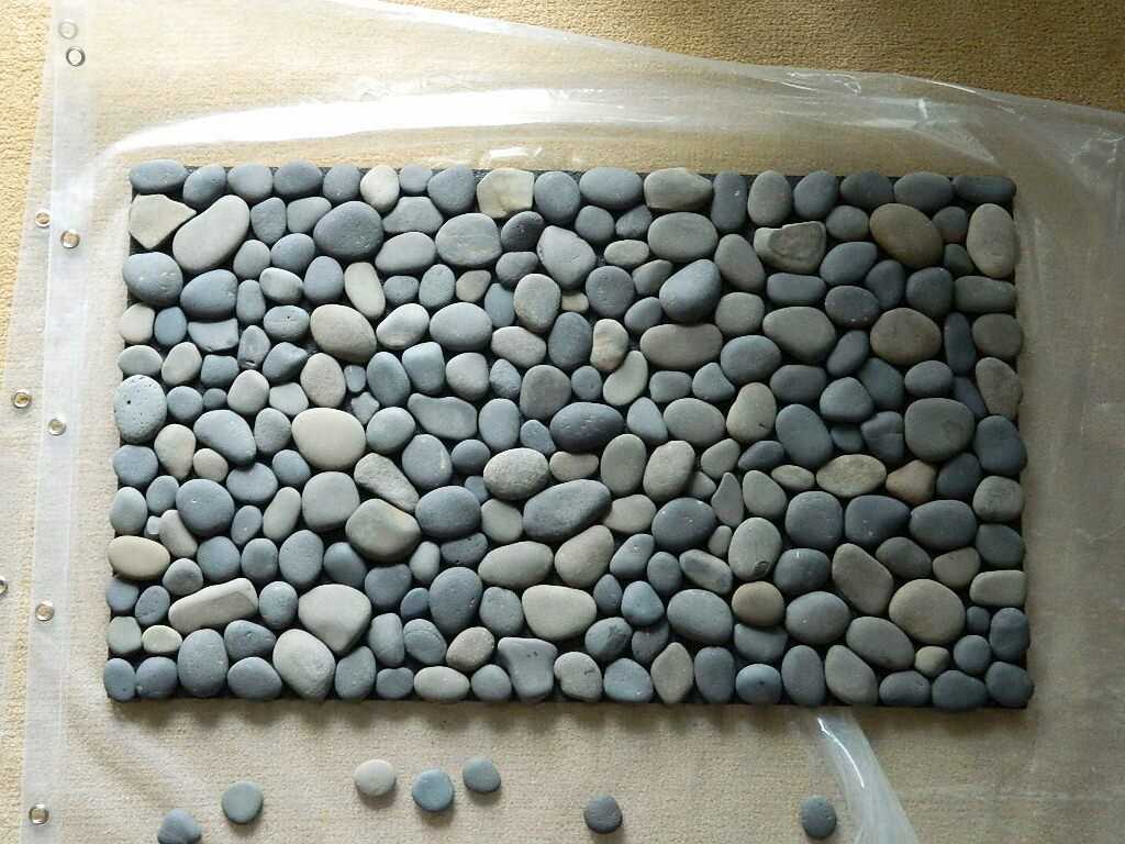 Сам резиновый коврик хорошенько очистите от пыли, а затем постепенно приклеивайте к нему камушки таким образом, чтобы сам коврик получился ровным.