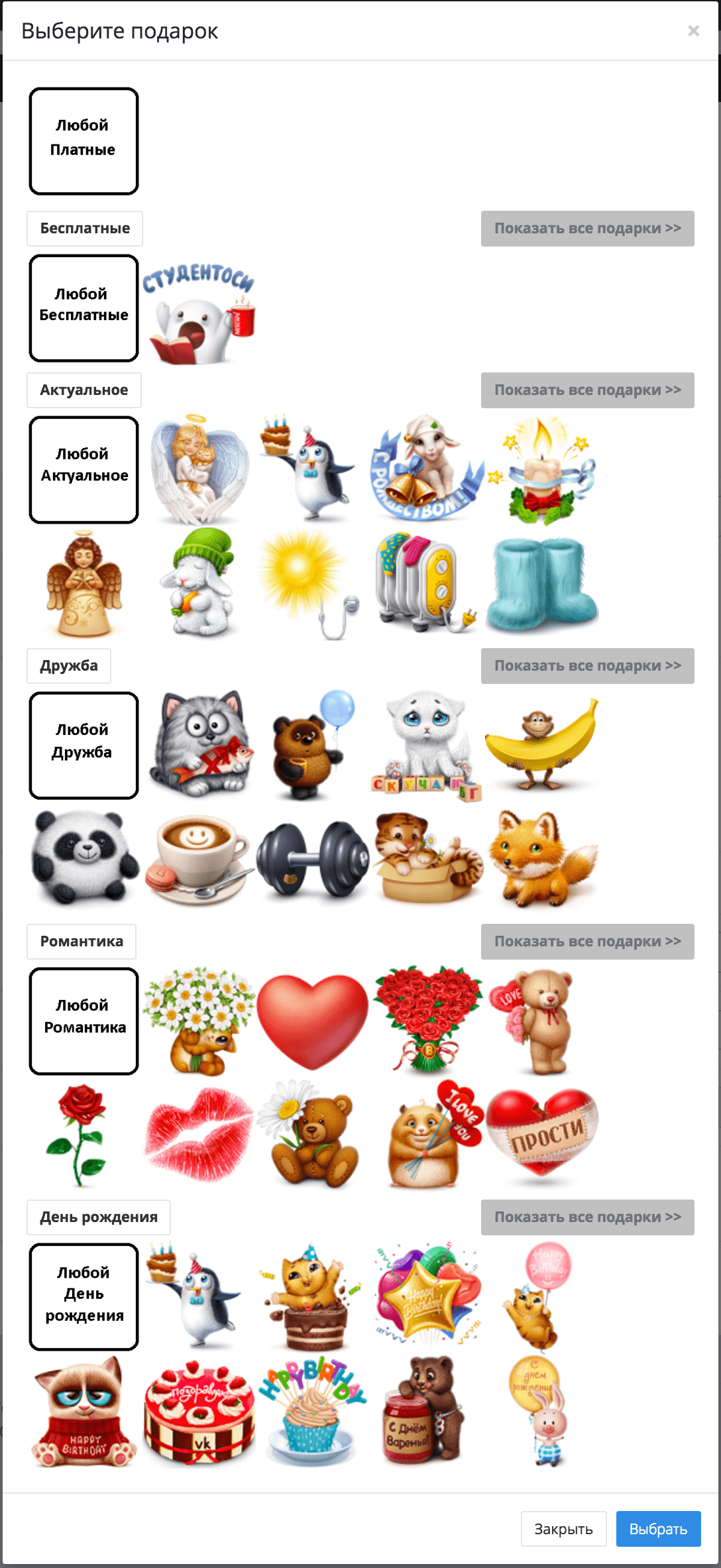 Для этого созданы десятки статичных и анимированных картинок с разным дизайном. При их использовании имя отправителя отображается получателю. Сам подарок отображается в личном сообщении у получателя, в диалоге с отправителем.
