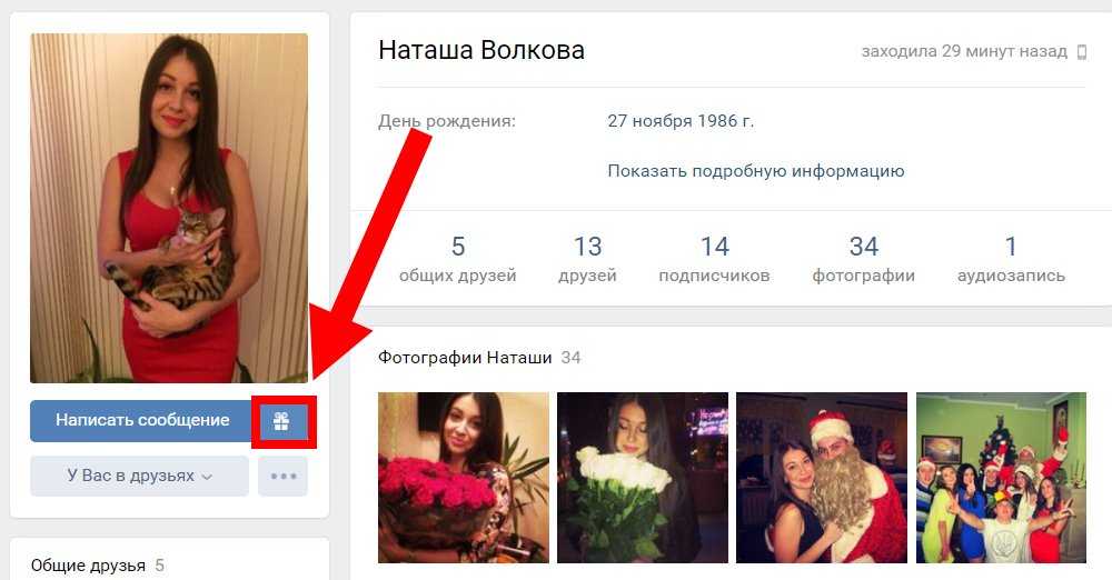 - Войдите на его страничку и возле кнопки написания сообщений жмите на символ упакованного подарка