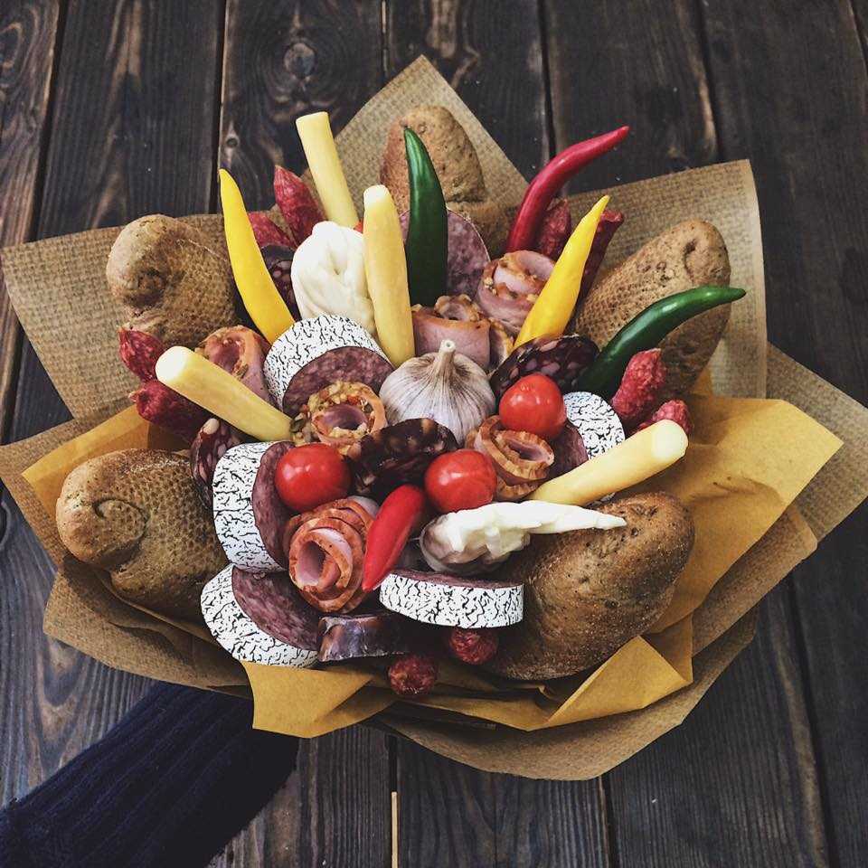 - Букет из продуктов (сушеной рыбы, орехов, сыра косичкой, колбасок, овощей и фруктов).