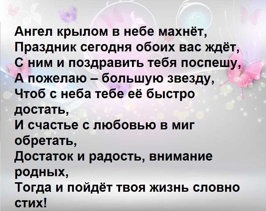 В День Ангела желаю Душевной красоты, Терпенья, пониманья, Исполненной мечтыЛюбви родных и близких, И с ангелом своим Дружить всем сердцем чистым, И верить в чудо с ним!