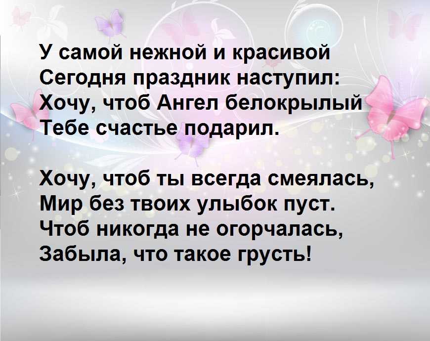 У самой нежной и красивой Сегодня праздник наступил: Хочу, чтоб Ангел белокрылый Тебе счастье подарил.
