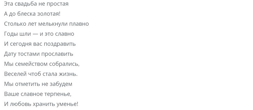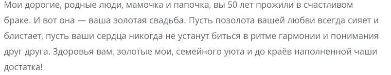 50 лет в браке – это целая жизнь. Вы празднуете годовщину свадьбы, которая называется золотой, но никто не говорит, что ваша жизнь была размеренной и спокойной. Однако, согласитесь, хорошего было больше, чем плохого, иначе мы бы не собрались таким составом сегодня. Будьте здоровы, поддерживайте и радуйте друг друга всегда и во всем.