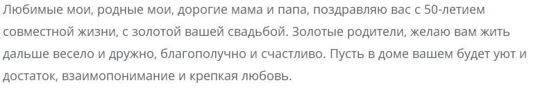Дорогие мама и папа! Вы можете гордиться своим 50-летним браком. Вы научили нас верить в любовь и прощать ошибки других. Мы всегда будем благодарны вам за это.