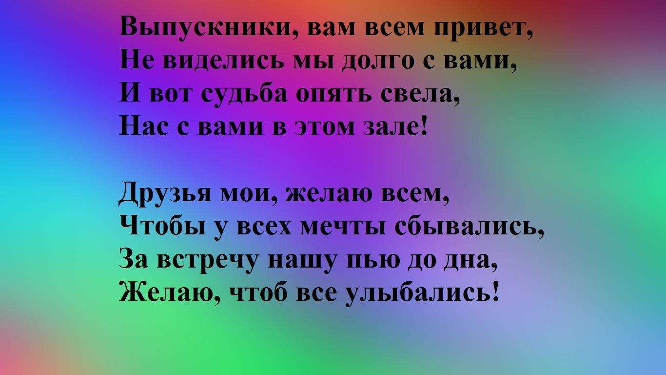 - выпускников одноклассники, как это замечательно – спустя встретиться определенное время и вспомнить свои детские веселые годы. Никто так не может воспоминания разделить о прошлой жизни, как вы, которые четко также их помнят. Давайте встречаться чаще, вспоминая, чтобы молодость, погружаться в беззаботные воспоминания и себе поднимать настроение и душой молодеть (хоть нас у она еще не стара!).