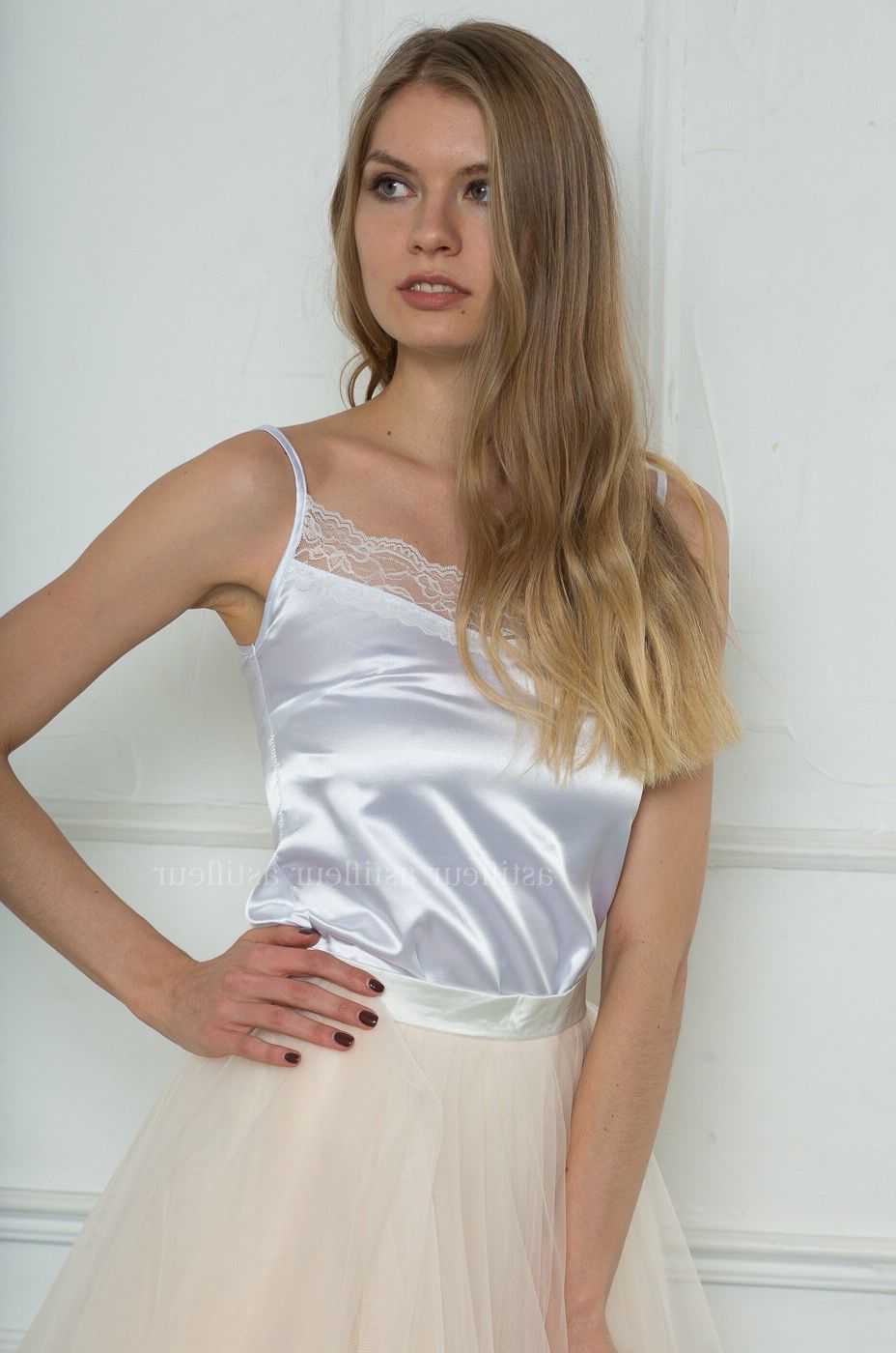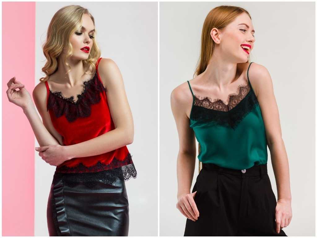 Девушкам миниатюрного сложения следует обратить внимание на шёлковый топ на бретелях украшенный обилием деталей – драпировок, с кружевом. Будет актуален сложный крой, вставки, асимметрия