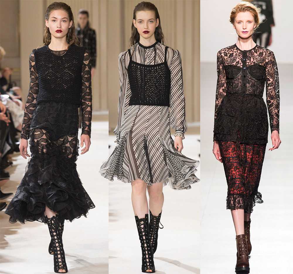 Одежда в этом стиле, выполненная в интенсивных угольных тонах, никогда не смотрится скучно и мрачно. Кружево и шикарная фактура материалов наполняют образы такой притягательностью и магнетизмом, что весь ансамбль вполне может быть выполнен монохромно, без включений других цветов.
