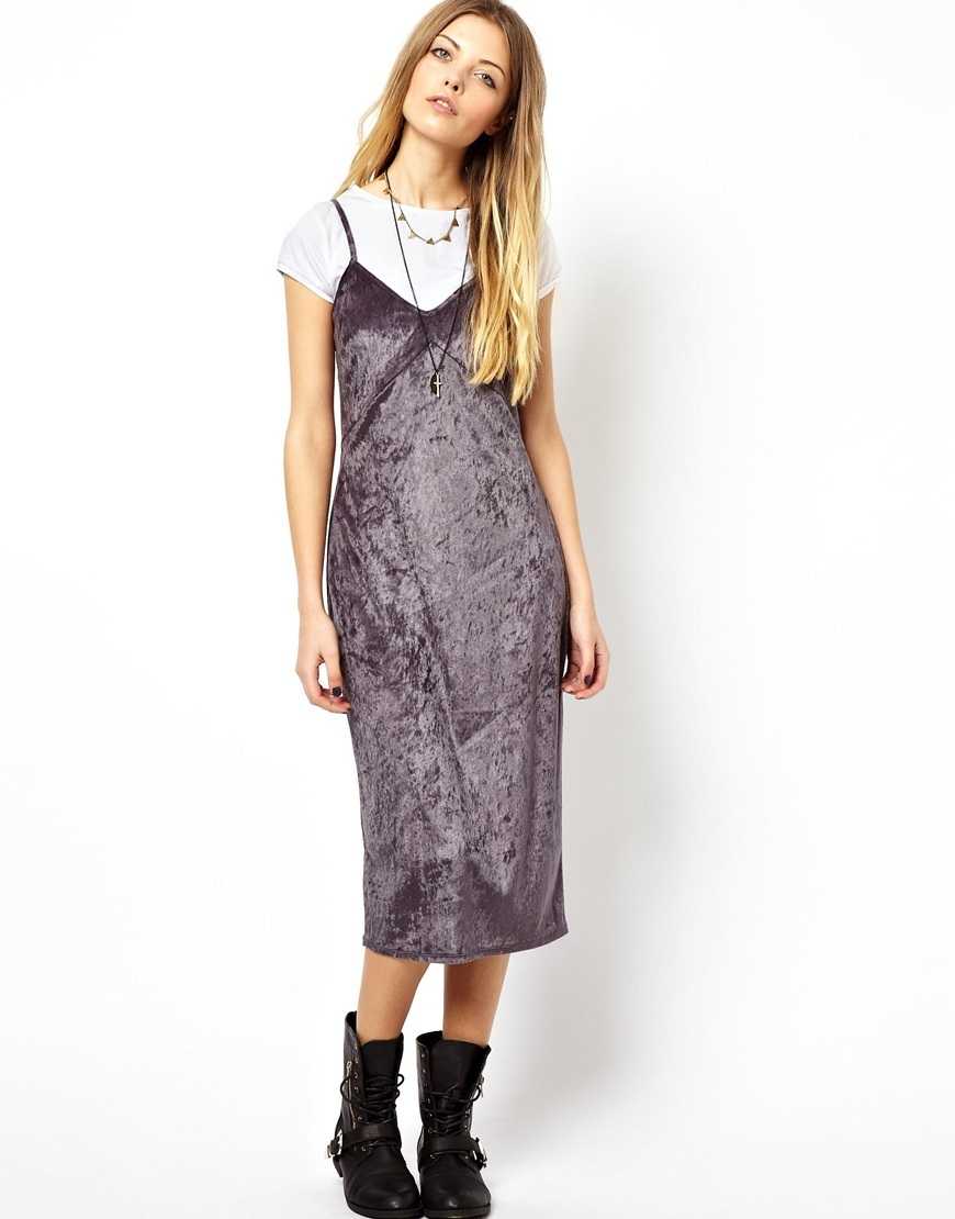 Вас не удастся уличить в «раздетости», если под платье-комбинацию вы наденете трикотажную футболку в стиле кэжуал. Платье на тонких бретелях может быть любой длины и дизайна, из обуви подберите ботинки или даже кроссовки.