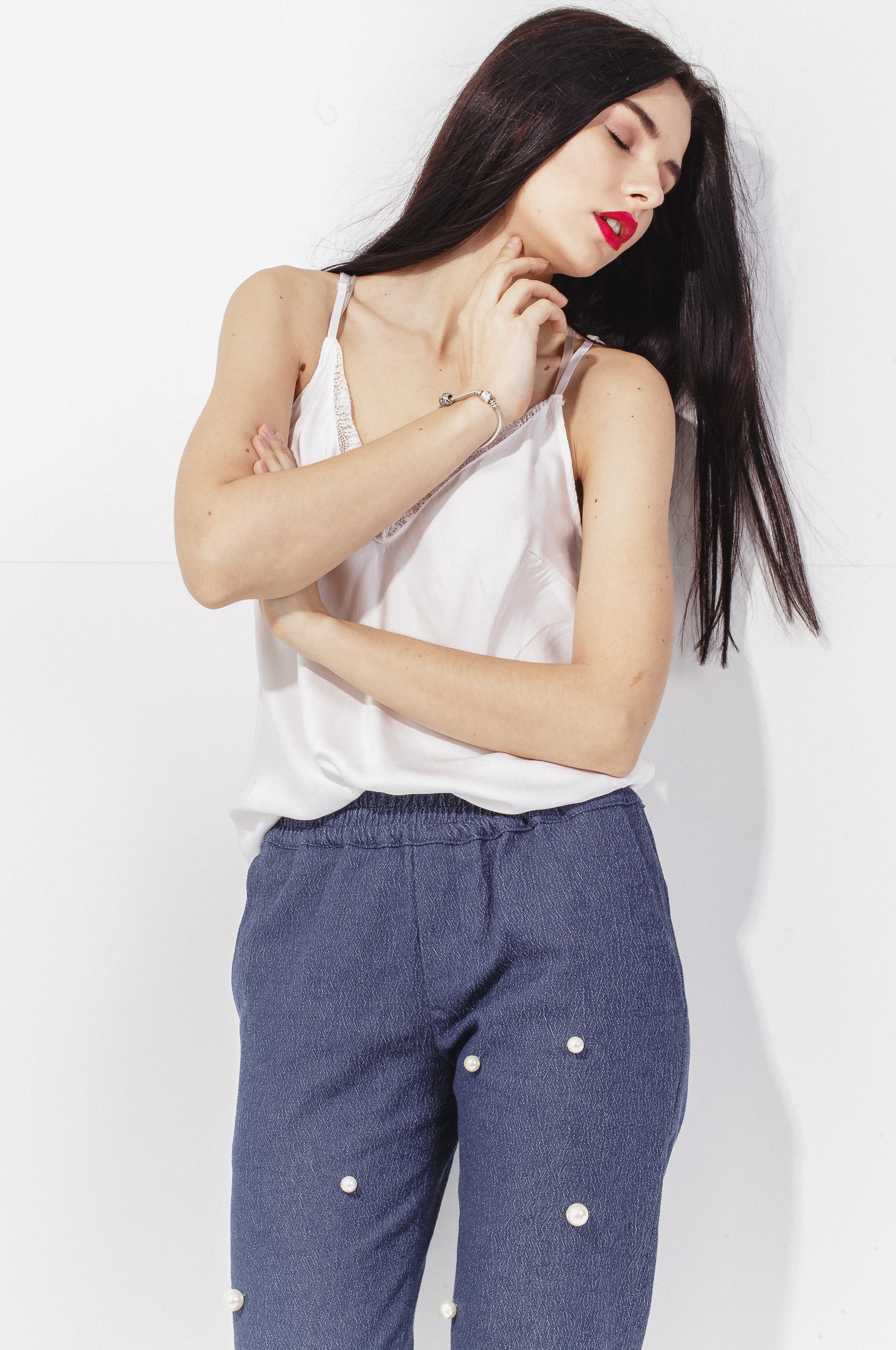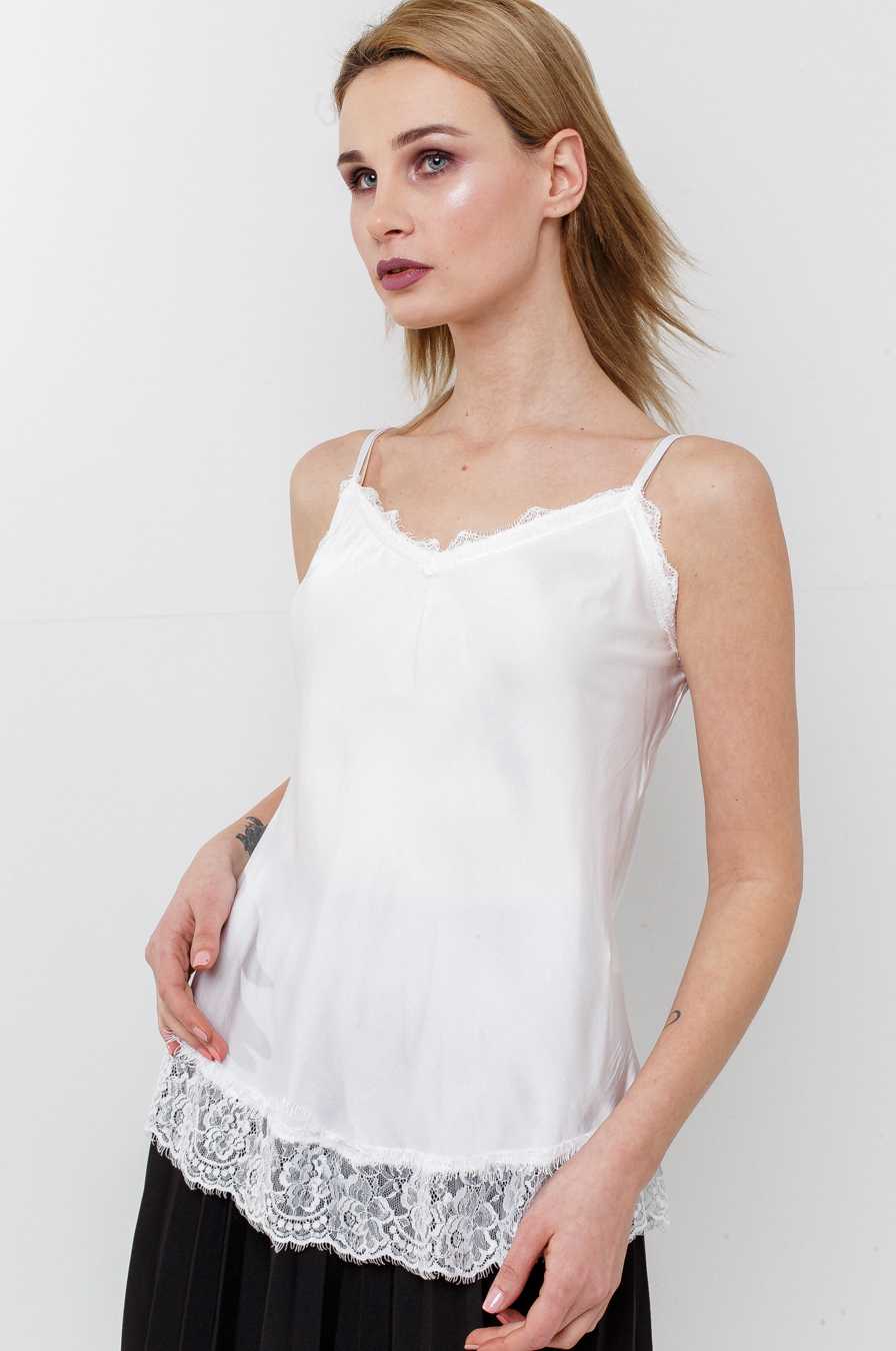 Самый популярный декор для топа в бельевом стиле — кружево. Такая отделка придает обладательнице женственности, привлекательности и хрупкости. Кроме того, используются гипюровые вставки для изделий. Благодаря декору модели в бельевом стиле находятся на грани между соблазнительностью и вульгарностью. Как правило, на подобной одежде минимум декоративных элементов.