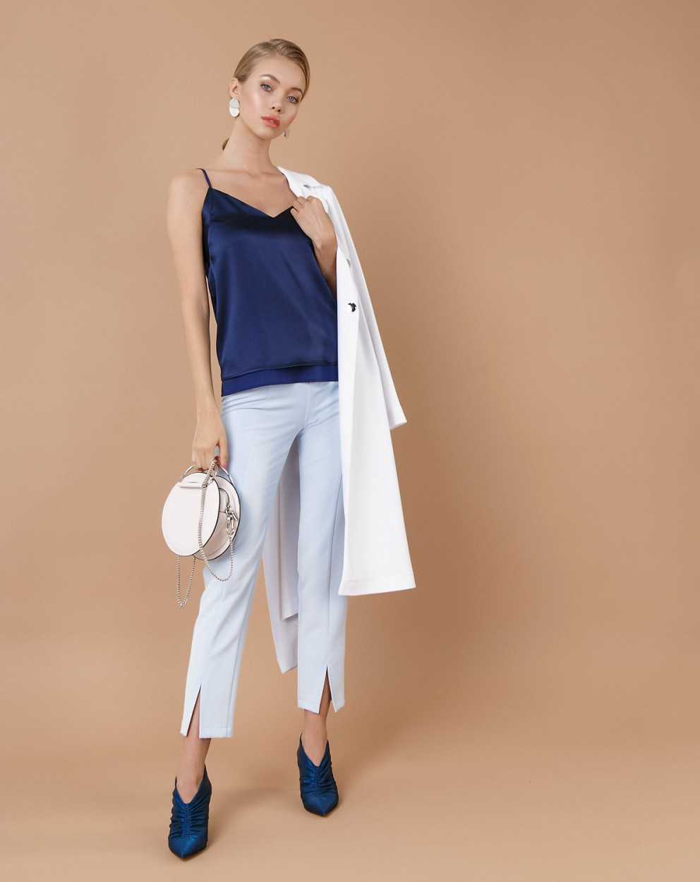Одна из модных тенденций этого сезона – сорочки и топы в спокойных темно-синих тонах, представленные на фото.