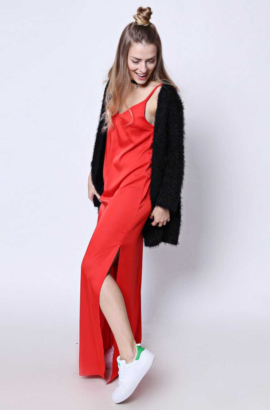 Сочетайте платья-комбинации с колготами. Колготки того же цвета, что и «комбинашка», красноречиво «скажут» окружающим, что барышня все же не забыла одеться, а напротив, со вкусом подошла к наполнению образа. Кстати, подобрав плотные колготки, вы можете больше не мучиться над вопросом – с чем носить платье-комбинацию зимой? Осталось только утеплиться и в таком виде можно отправляться покорять морозные улицы.
