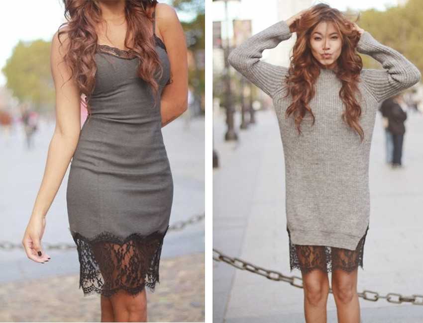 Еще один «теплый» вариант – платье-комбинация + свитер. Особенно интересно такой тандем будет смотреться с короткими кружевными комбинашками. Кружевной край подола, кокетливо выглядывающий из-под массивного длинного свитера, смотрится очень интригующе.