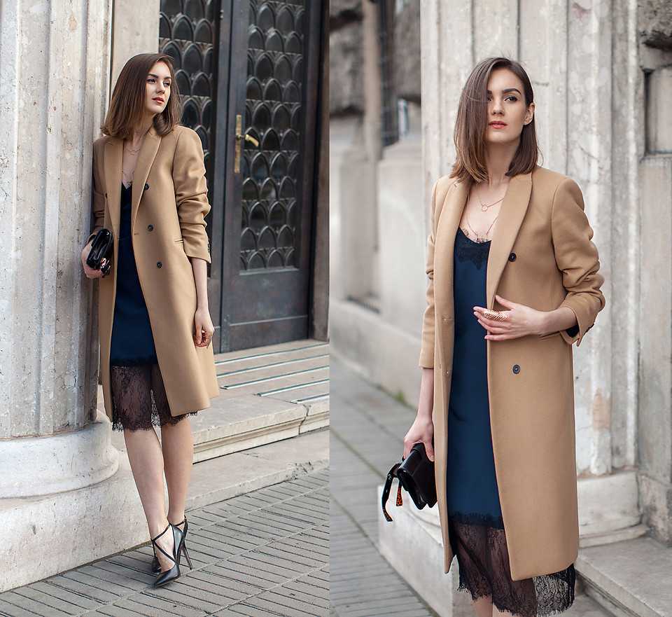 В осеннее время платья-комбинации можно «утеплять» с помощью пальто. Если вы готовы эпатировать публику, выбирайте короткое кружевное платье-комбинацию. Распахнув пальто вы «убьете» окружающих неожиданным эффектом «нижнего белья, выставленного напоказ». Важная деталь – пальто должно показывать не более пары сантиметров платья, а лучше – полностью скрывать подол.