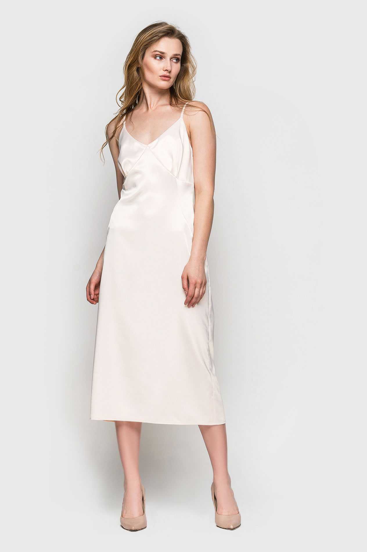 С чем носить платье-сорочку в бельевом стиле из атласа цвета слоновой кости без дополнительного декора?