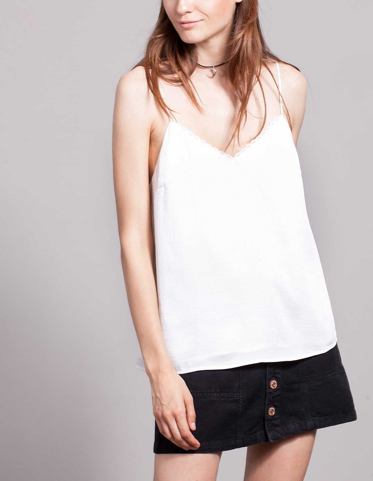- Майка-комбинация. Модель напоминает женское нижнее ночное белье, предполагает тонкие бретельки, глубокий вырез, полукруглый или треугольный, облегающий или свободный фасон. Длина достигает талии или верхней части бедра. Майка может быть украшена кружевом, драпировкой, воланом или отличаться лаконичным дизайном. Популярен асимметричный крой. Составить комплект можно при помощи брюк, юбок, шорт; наверх надевают жакеты, рубашки, кардиганы. Облегающая комбинация подойдет девушкам со стройной фигурой. Тонкие бретели хороши для дам со скромными размерами груди.