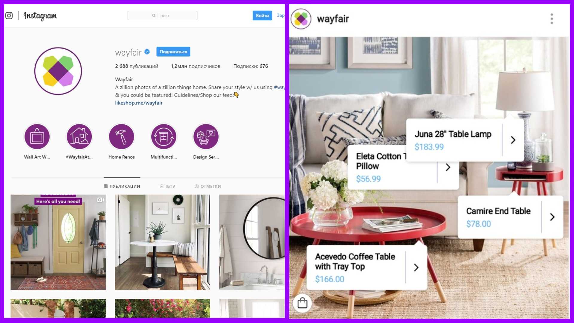 Если в англоязычной прессе заходит разговор о результативности продвижения ритейлеров в соцсетях, то первым всегда вспоминают американский онлайн-магазин товаров для дома Wayfair. На аккаунт ритейлера в Facebook подписано 7,2 млн человек, на аккаунт в Instagram — 1,2 млн.
