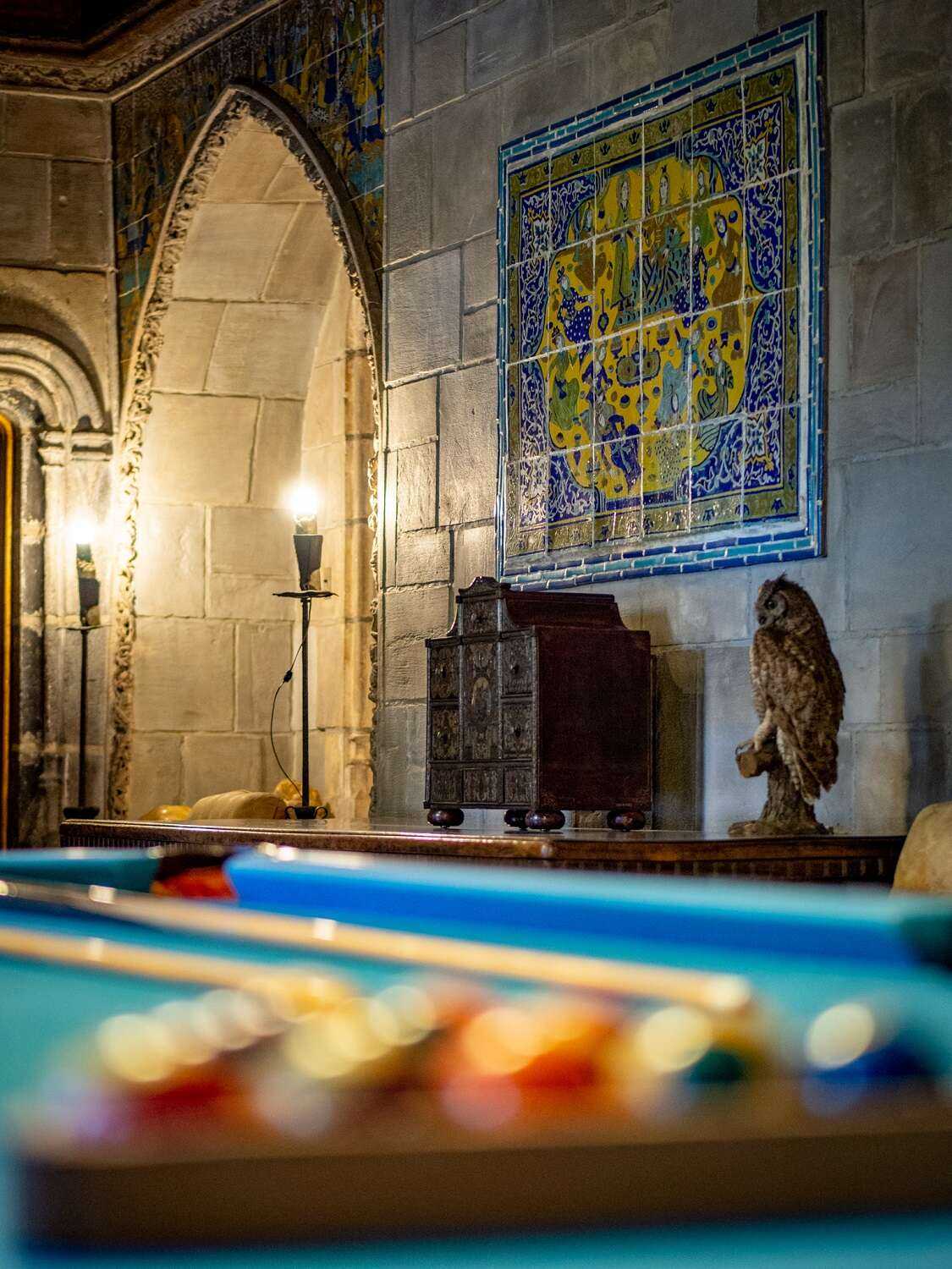 В другой комнате готические арки соседствуют с бильярдным столом, византийской керамикой и чучелом совы.