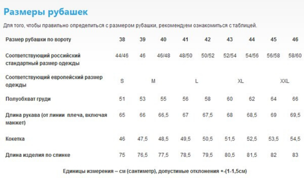 Для того чтобы правильно определить подходящее изделие, изучите таблицу размеров рубашек по вороту и указанные в ней значения.