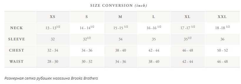 Известные мировые бренды в своих размерных сетках всегда указывают нужные размеры рубашек. Например, магазин Brooks Brothers даёт следующую таблицу мерок в дюймах: обхват шеи (NECK), длина рукава (SLEEVE), обхват груди (CHEST) и обхват талии (WAIST).