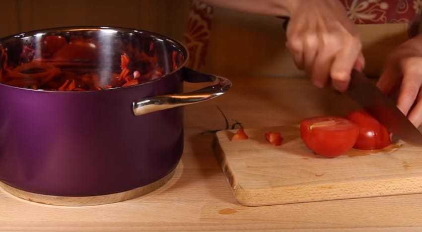 Морковь трем на терке. Помидоры очищаем от кожицы и тушим в небольшом количестве масла. Добавляем крупно нарезанный лук, измельченный чеснок и натертую на терке морковь.