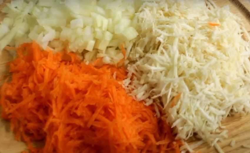 - Для начала нужно подготовим все продукты: почистим и помоем овощи, нашинкуем мелко белокочанную капусту.