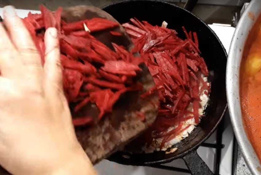3. Поставьте лук с морковью пассероваться в небольшом количестве разогретого растительного масла на сковороде. К подрумянившимся овощам добавьте нашинкованную свеклу.