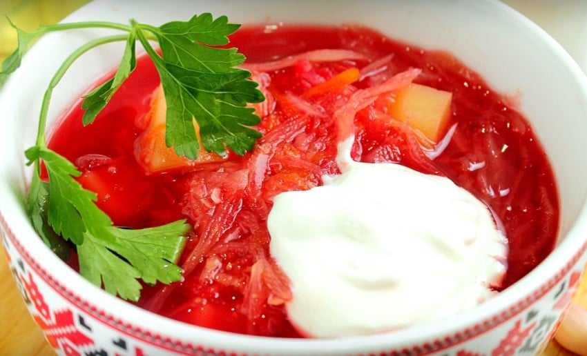 Постный классический борщ готов! Последним мазком художника-кулинара станет белоснежное пятно сметаны на этом чудном красном поле – разумеется, для тех, кто не постится, а просто соблюдает диету или не любит мясных бульонов.