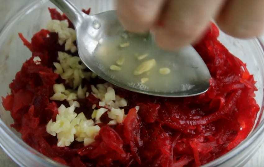 - Половину порции тертой свеклы выложим в глубокую миску и зальем кипятком. Добавим ложку столового уксуса и оставить смесь на 30 минут.