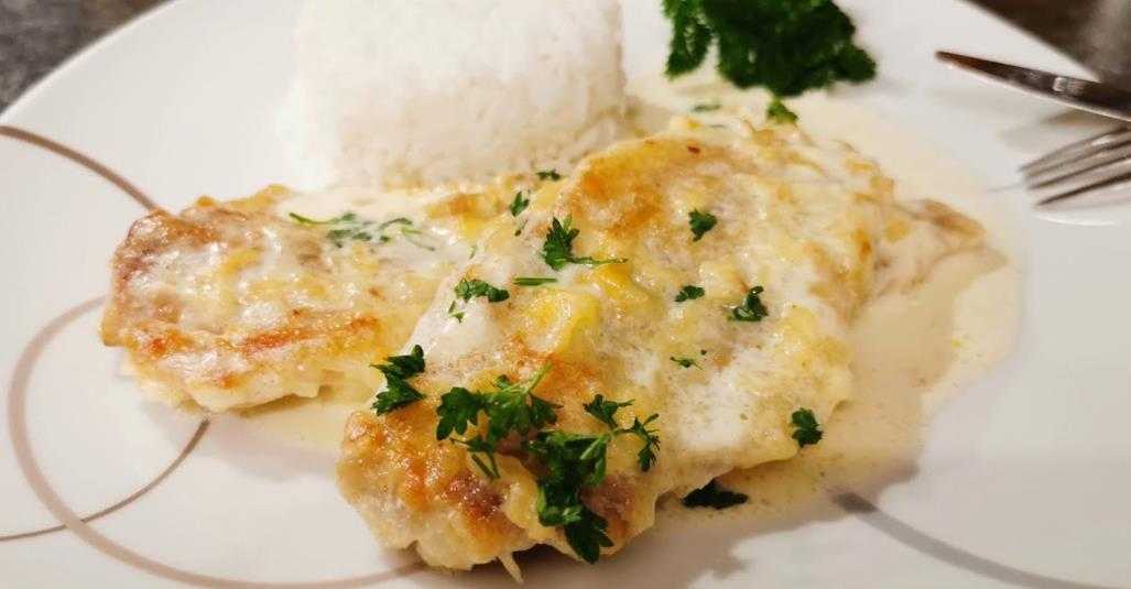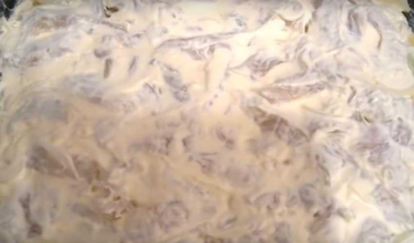 - Лук покрывается частью соуса из сливок.
