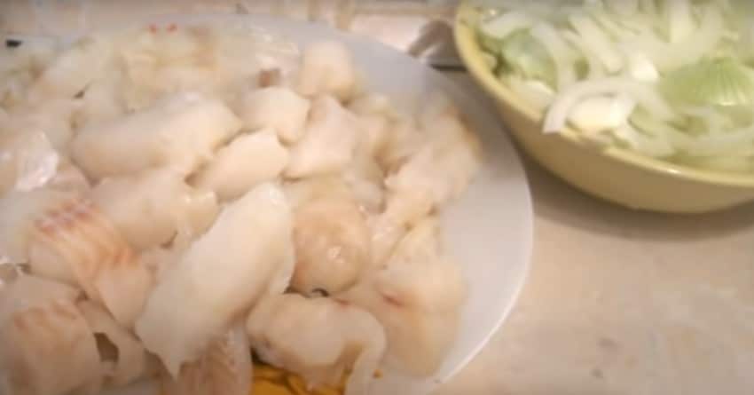 - На луковый слой раскладываем подготовленные кусочки трески.