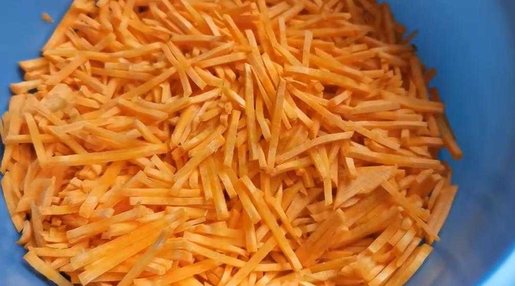 Далее нужно подготовить морковку — промыть ее и натереть на крупной терке. Делайте это не спеша. Вообще с теркой спешить нельзя, так как велика вероятность повредить пальцы. Так что поосторожней.