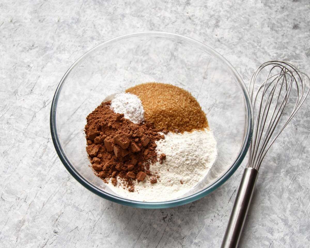 - В отдельной емкости смешивают муку, крахмал и какао. Ингредиенты просеивают, после чего откладывают в сторону.