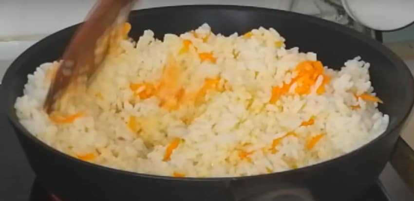 4. Когда морковь станет мягкой, добавьте заранее отваренный рис. Перемешайте и жарьте еще 2-3 минуты. Остудите начинку.
