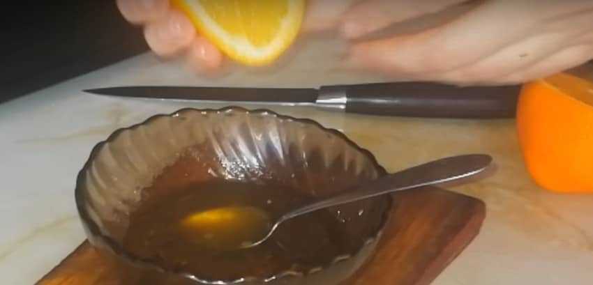 2. Для маринада смешайте мёд, сок половины апельсина и растительное масло.