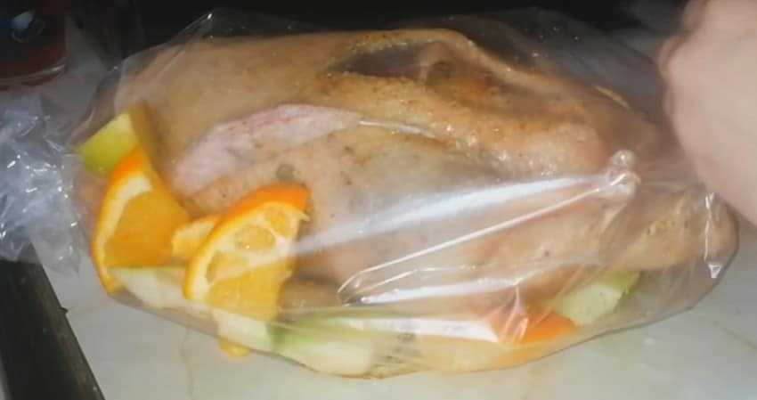 Утка с рисом в духовке, запеченная в рукаве с яблоками и апельсинами