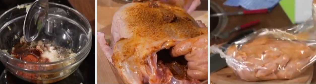 - Вымытую и обсушенную тушку птицы натрите солью и перцем, оставьте на несколько часов.