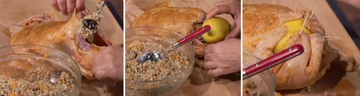 5. Заполните брюшко птицы начинкой. Сверху полейте рис 4-5 ст.л. маринада.