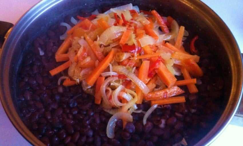 Обжарить томаты и перец до мягкости. Всыпать фасоль.