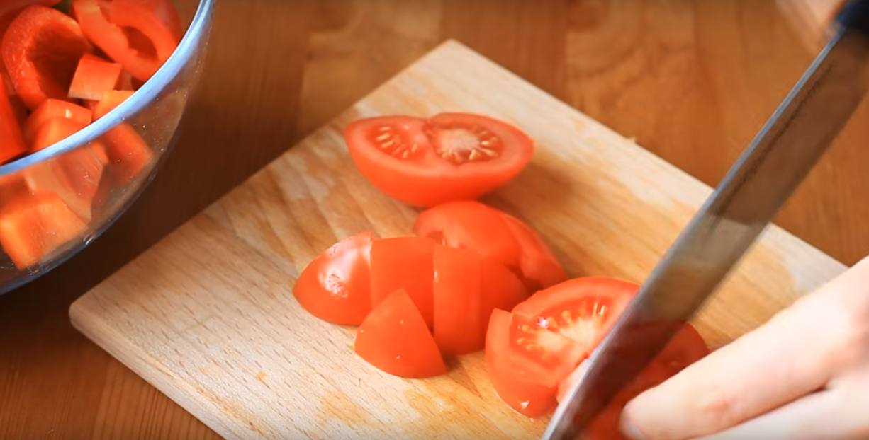 - Тщательно моем овощи. Такие овощи как помидоры, огурцы и перец необходимо нашинковать крупными кусочками.