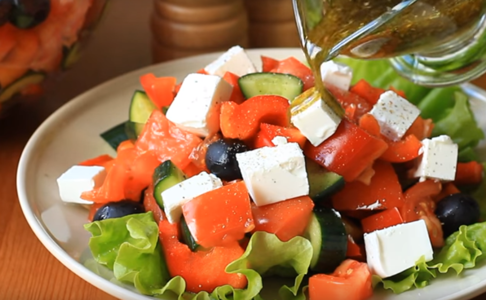 Дешевый диетический греческий салат с заправкой из соевого соуса с лимоном