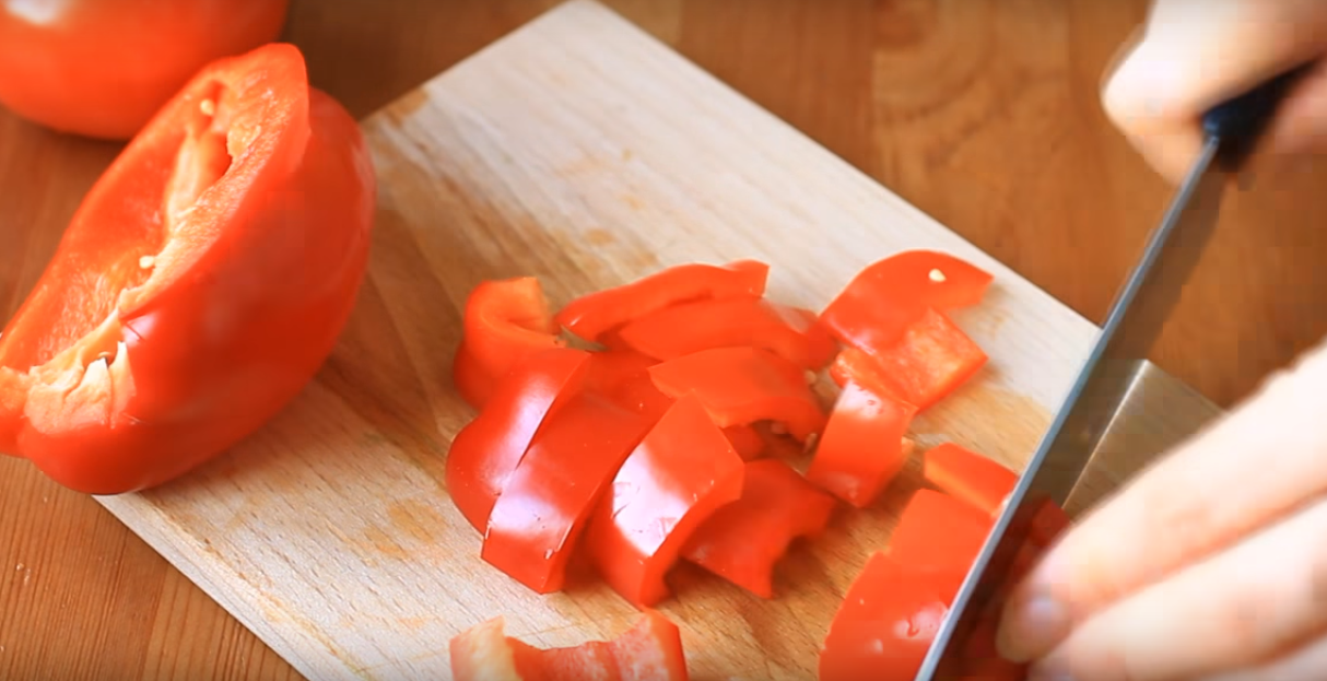 Болгарский перец необходимо очистить от семечек и перегородок. Цвет перца не играет особой роли. Просто красный и желтый немного слаще зеленого.