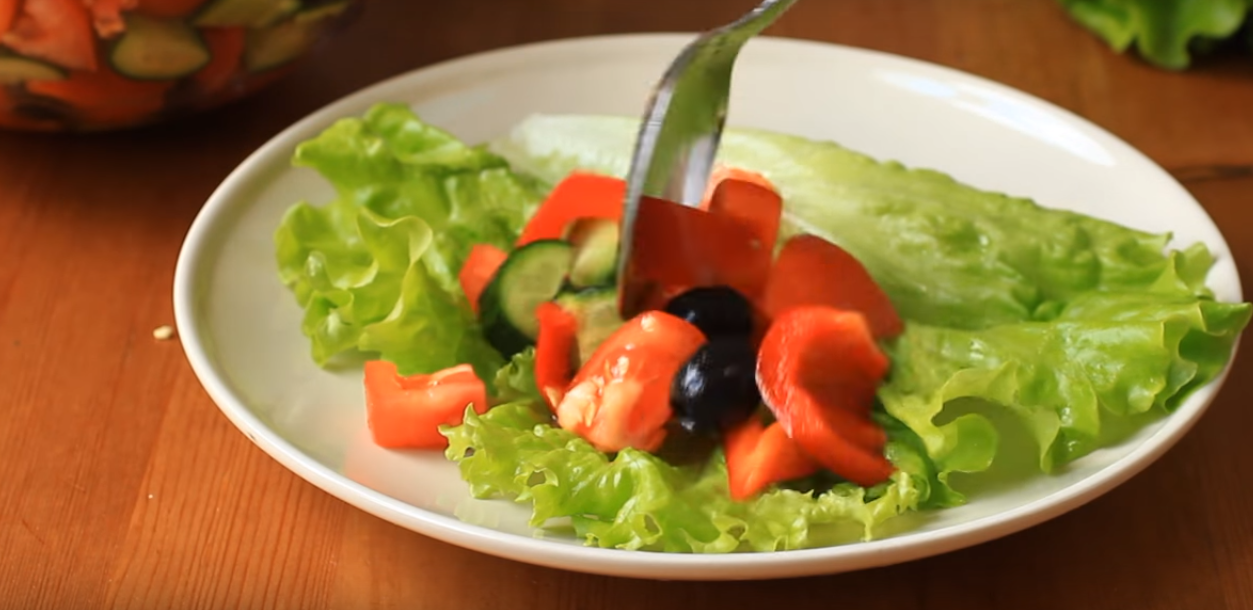 3. На сервировочную тарелку выкладываем листья салата и аккуратно перекладываем на нее овощи.