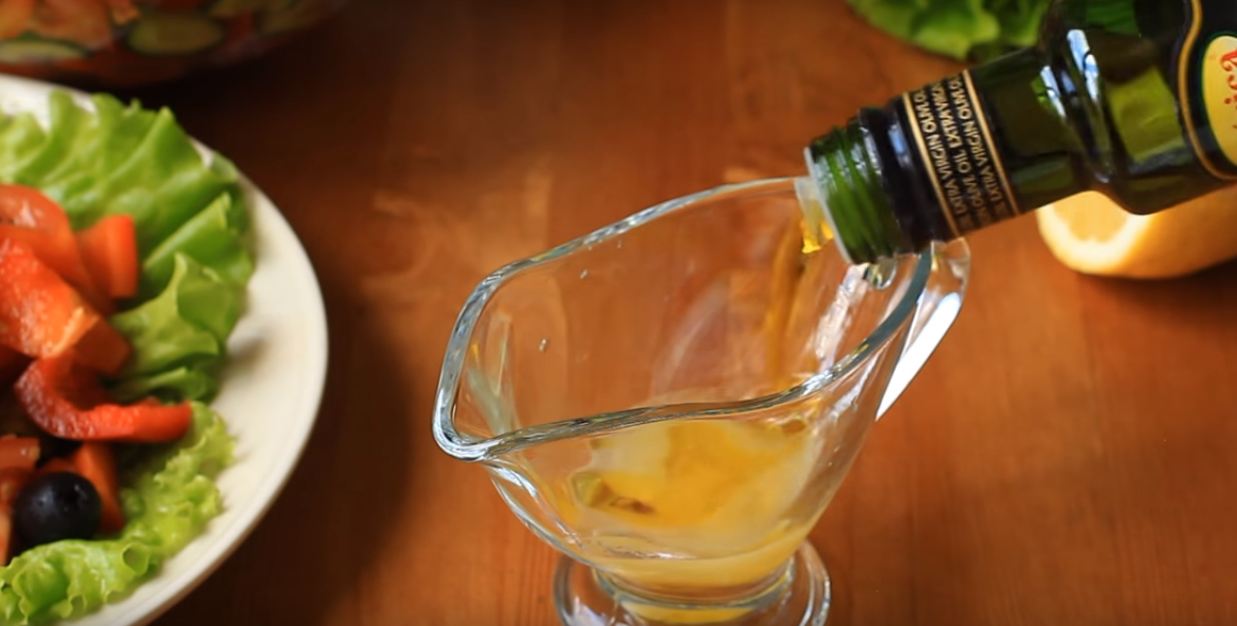 Выжимаем в посудину сок лимона (сам лимон нам больше не нужен) и добавляем к нему оливковое масло.