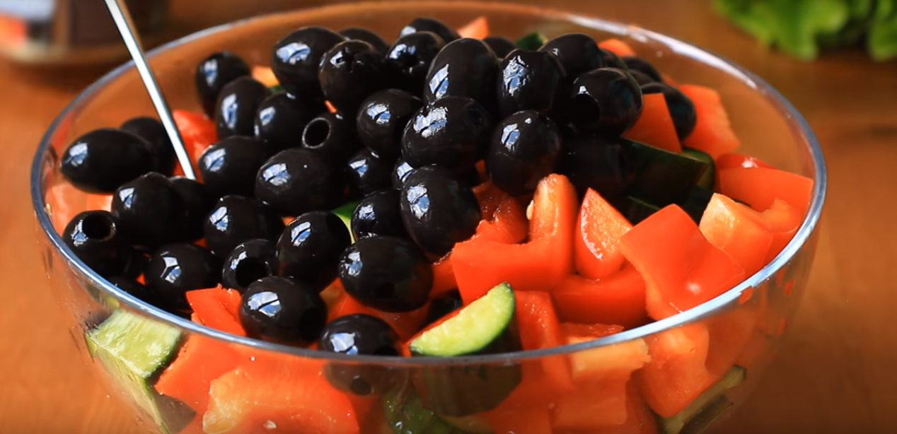 2. Складываем овощи в одну миску и добавляем к ним маслины
