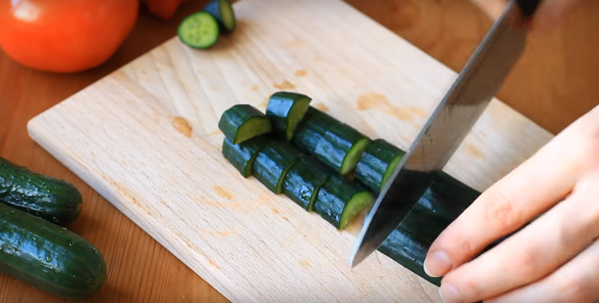 Огурец можно очистить от кожуры, а можно оставить неочищенным. Не забудьте только отрезать кончики.