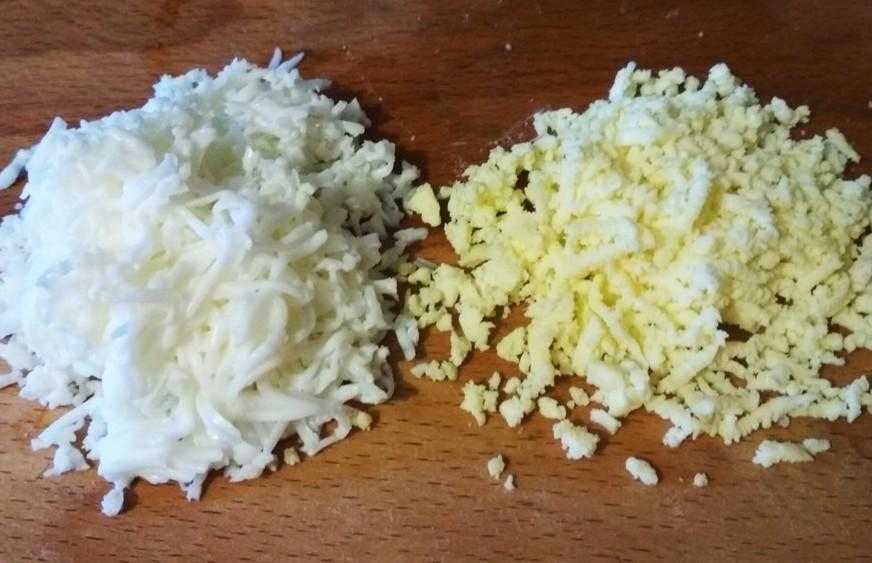 - Отвариваем яйца, отделяем желтки от белков. На терке натираем желтки. Белки мелко нарезаем кубиками.