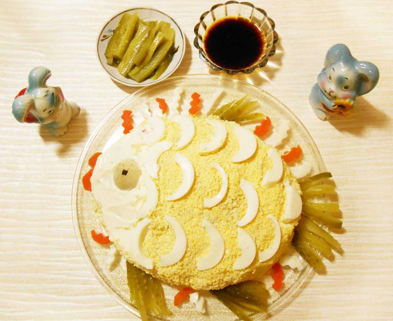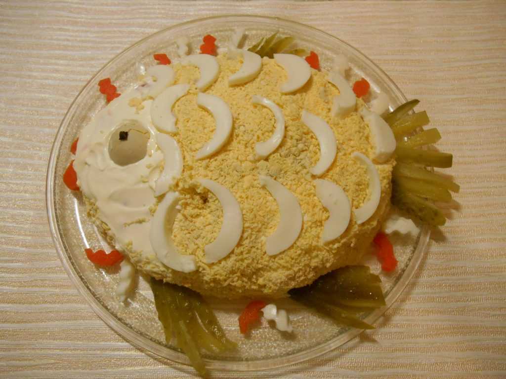 Белки нарезаем полу-кружками и располагаем в виде чешуи. Из кружочков моркови разного размера, делаем рот. Огурцы нарезаем пластинками, а затем полосками, но не до конца. Делаем хвост и плавники. Салату нужно настоятся в холодильнике, не менее 2 часов.
