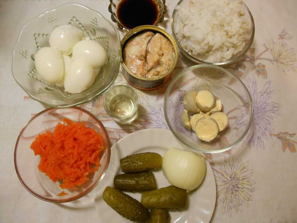На снимке — продукты для салата. Рис отвариваем до готовности, промываем холодной кипячёной водой. Яйца и морковь тоже отвариваем по отдельности. Лук почистим и помоем.