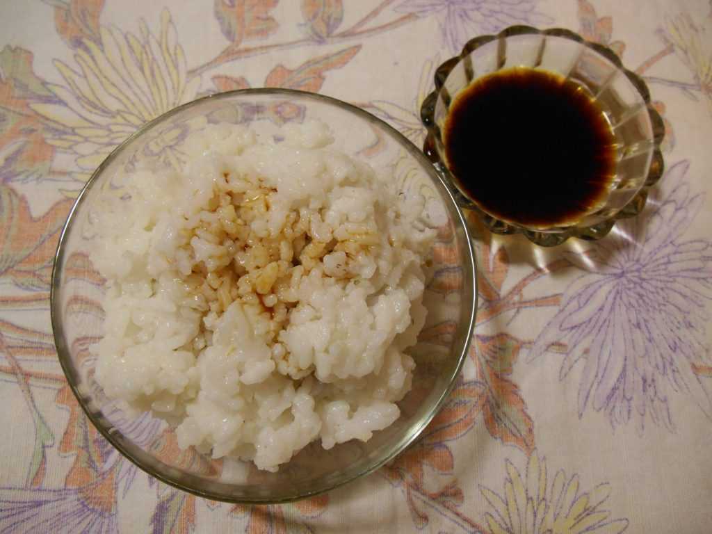 В отварной рис добавим соевый соус, совсем немного, чтобы рис не стал жидким.
