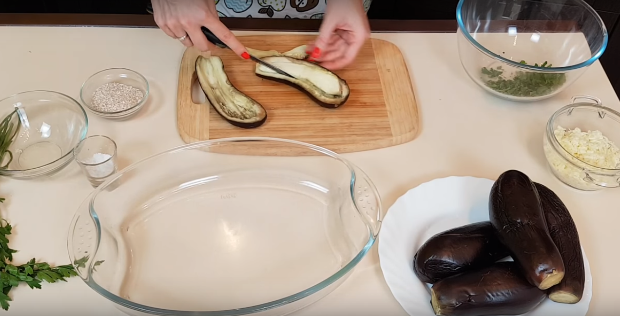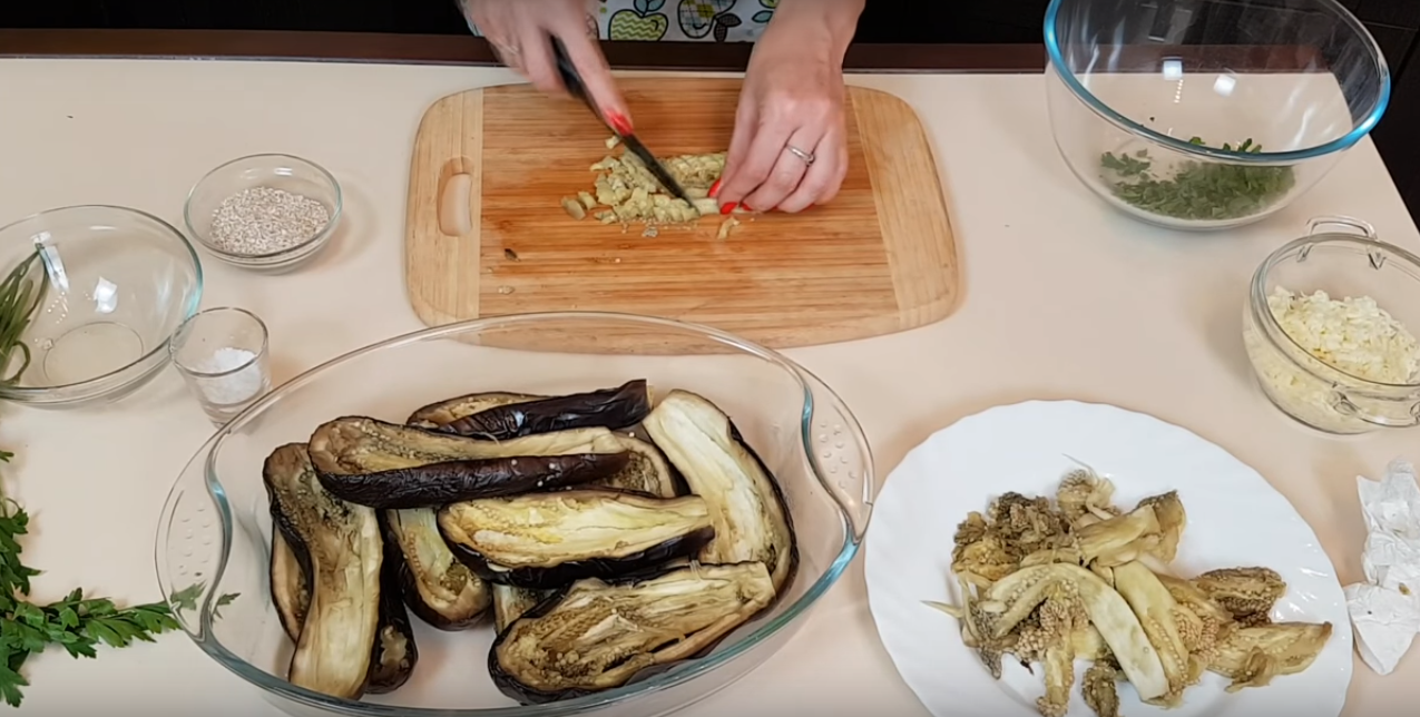 Как приготовить заправку? Смешиваем: выдавленный чеснок, мелко нарезанный перец чили, очень мелко нарезанная петрушка и 1/2 чайной ложки растительного масла. Эту заправку мы выкладываем на баклажаны, а сверху помидор….Подробно можно прочитать и посмотреть ЗДЕСЬ.